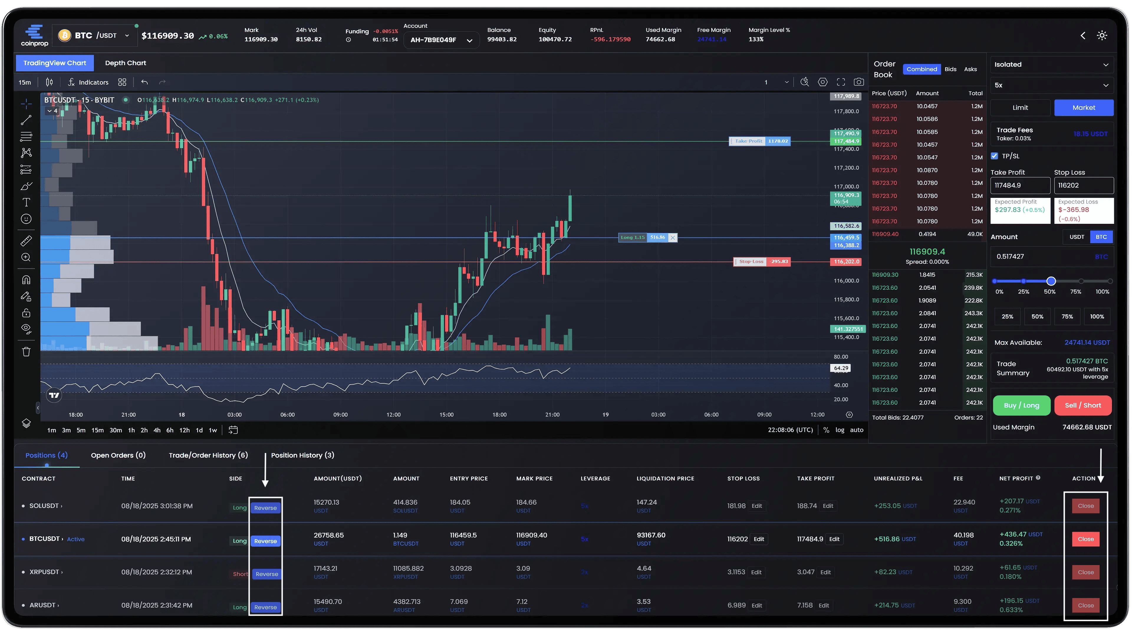 Reverse: This button is used to reverse a transaction. For example, if you have a long position, using the "Reverse" button will close the long and open a short position of the same size using a market order.